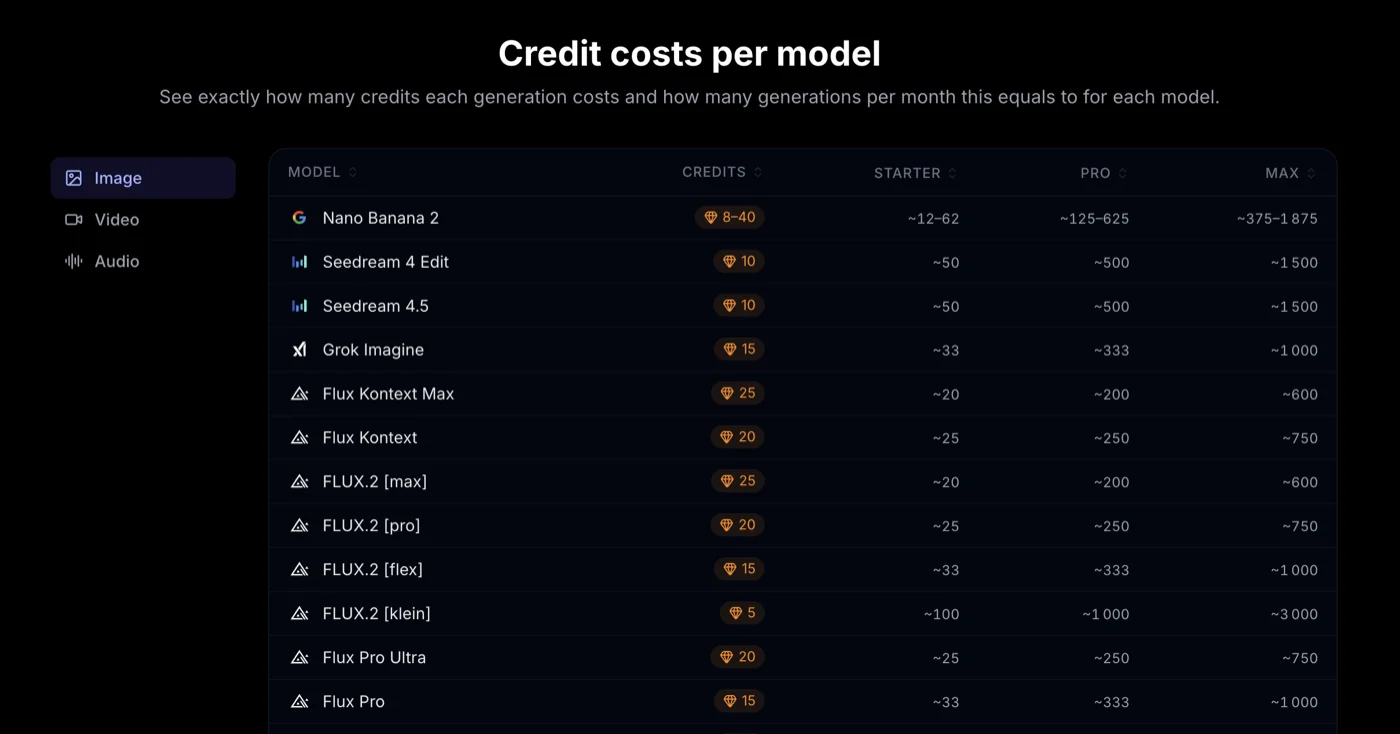 - Images: Nano Banana 2 (15 credits) or FLUX.2 max (25 credits)